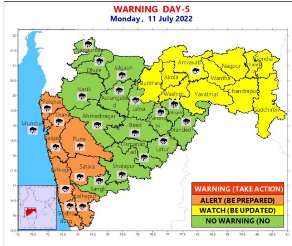 मुंबई, दि. ८  हवामान खात्याकडून राज्यात पुढील ३ दिवस म्हणजे दिनांक ११ जुलै, २०२२ पर्यंत अतिवृष्टीचा इशारा देण्यात आला आहे. विशेषतः कोकण विभागातील सर्व जिल्ह्यांना मुसळधार ते अति मुसळधार (६४ ते २०० मिमी) पावसाचा इशारा देण्यात आले आहे.