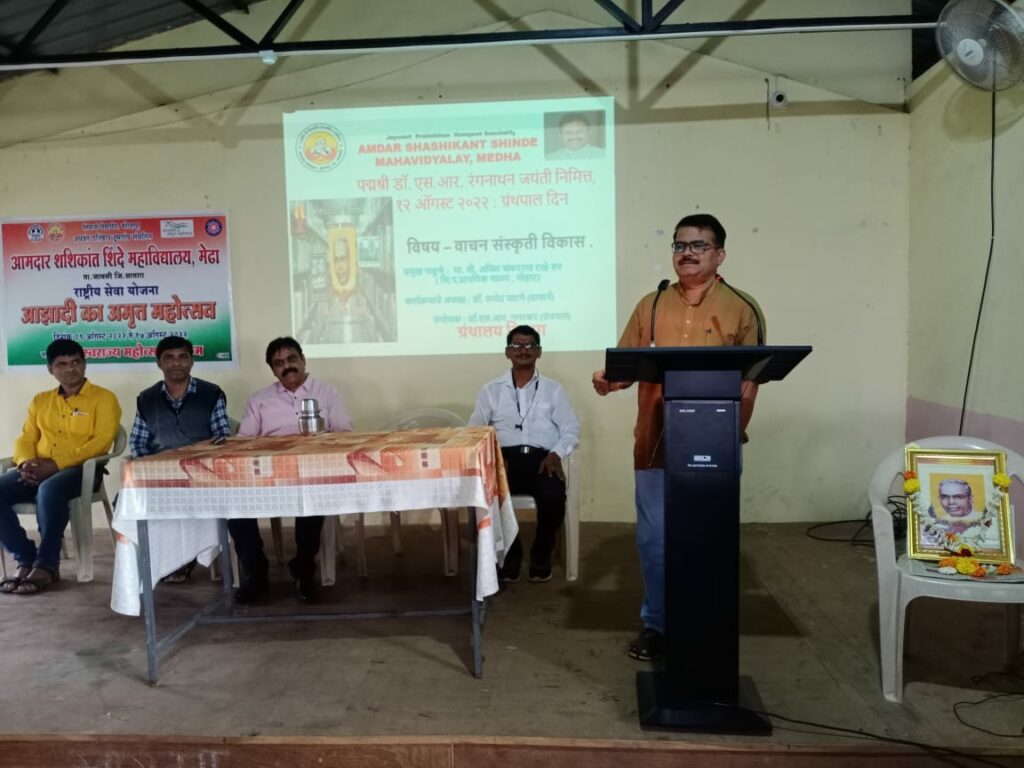 मेढा. दि.१४. दिनांक 12 ऑगस्ट 2022 रोजी पद्मश्री डॉ. एस आर रंगनाथन यांच्या जयंतीनिमित्त आमदार शशिकांत शिंदे महाविद्यालयात ग्रंथपाल दिन साजरा करण्यात आला. प्रास्ताविक डॉ. एस आर नगरकर यांनी केले प्रस्ताविकात ग्रंथपाल दिन का साजरा केला जातो डॉ. एस आर रंगनाथन यांचे जीवन चरित्र तसेच कार्यक्रमाचा उद्देश सांगण्यात आला.