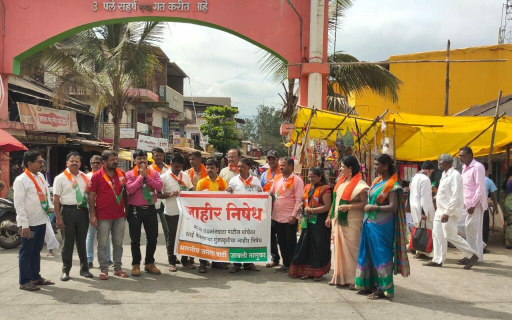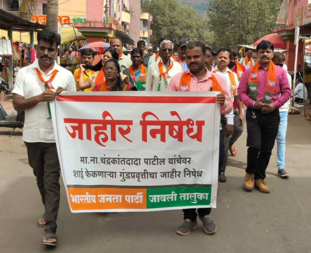 मेढा.दि.१२.मा.मंत्री चंद्रकांत दादा पाटील यांच्यावर झालेल्या शाई हल्ल्याचा भाजपा जावली कडून तिव्र निषेध .भाजपाचे जेष्ठ नेते, उच्चतंत्र शिक्षण व वस्त्रोद्योग मंत्री मा.ना. चंद्रकांत दादा पाटील यांचेवर पुणे येथे झालेला शाई फेक हल्ला व त्याला ताकद देणाऱ्या राजकीय व सामाजिक प्रवृत्त्या यांचा निषेध करण्यासाठी भाजपा जावली कडून छत्रपती शिवाजी महाराज चौकात निदर्शने करून , निषेध मोर्चा काढत माननीय जावली तहसीलदार सो यांना निवेदन देण्यात आले.