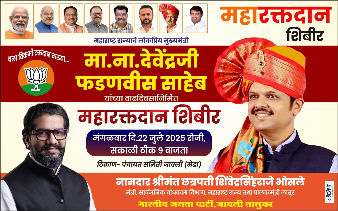 राज्याचे बांधकाममंत्री ना.श्रीमंत छत्रपती शिवेंद्रसिंहराजे भोसले आणि संचालक ज्ञानदेव रांजणे यांच्या सूचनेप्रमाणे मंगळवार दिनांक २२ जुलै रोजी पंचायत समिती जावली येथे रक्तदात्यांनी आणि भाजपच्या प्रत्येक कार्यकर्त्याने या रक्तदान शिबिरामध्ये अधिकाधिक संख्येने रक्तदान करण्याचे आवाहन सागरजी धनावडे यांनी केले आहे.