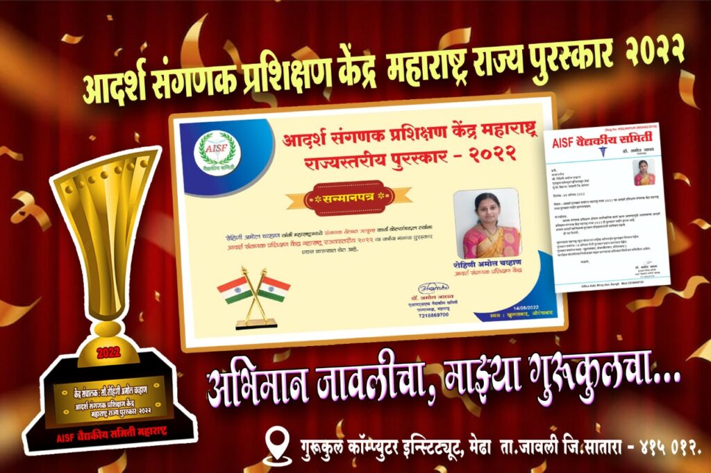 गेली १४ वर्षे गुणवत्ता जोपासणारे सातारा जिल्हयामध्ये जावली तालुक्यात उत्कृष्ट संस्था म्हणून गुरूकुलला आदर्श संगणक प्रशिक्षण केंद्र महाराष्ट्र राज्यस्तरीय २०२२ हा मानाचा पुरस्कार मिळाला.या पुरस्कार समारंभासाठी राष्ट्रपती पुरस्कार विजेत्या आशाताई गजरे डॉ.राजश्री कटके Aisf वैद्यकीय समिती चे राज्याध्यक्ष डॉ.अमोल जाधव मान्यवराची उपस्थिती देण्यात आला.संगणक क्षेत्रामध्ये दर्जेदार शिक्षण देणे आणि विद्यार्थांना सर्वगुण संपन्न करणे हा आमचा हेतू आहे तसेच विद्यार्थी व पालक यांनी दाखविलेला विश्वास यामुळेच हे प्रमाणपत्र आम्हास मिळाले आहे असे गुरुकुल च्या सौ चव्हाण यांनी व्यक्त केले